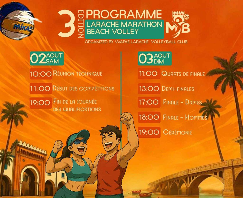 في إطار احتفالات عيد العرش المجيد، تحتضن مدينة العرائش نهاية الأسبوع المقبل فعاليات الدورة الثالثة من ماراثون العرائش للكرة الطائرة الشاطئية، وذلك يومي السبت والأحد 2 و3 غشت 2025، على رمال شاطئ بيليغروسا، في مبادرة رياضية متميزة ينظمها نادي وفاء العرائش للكرة الطائرة.